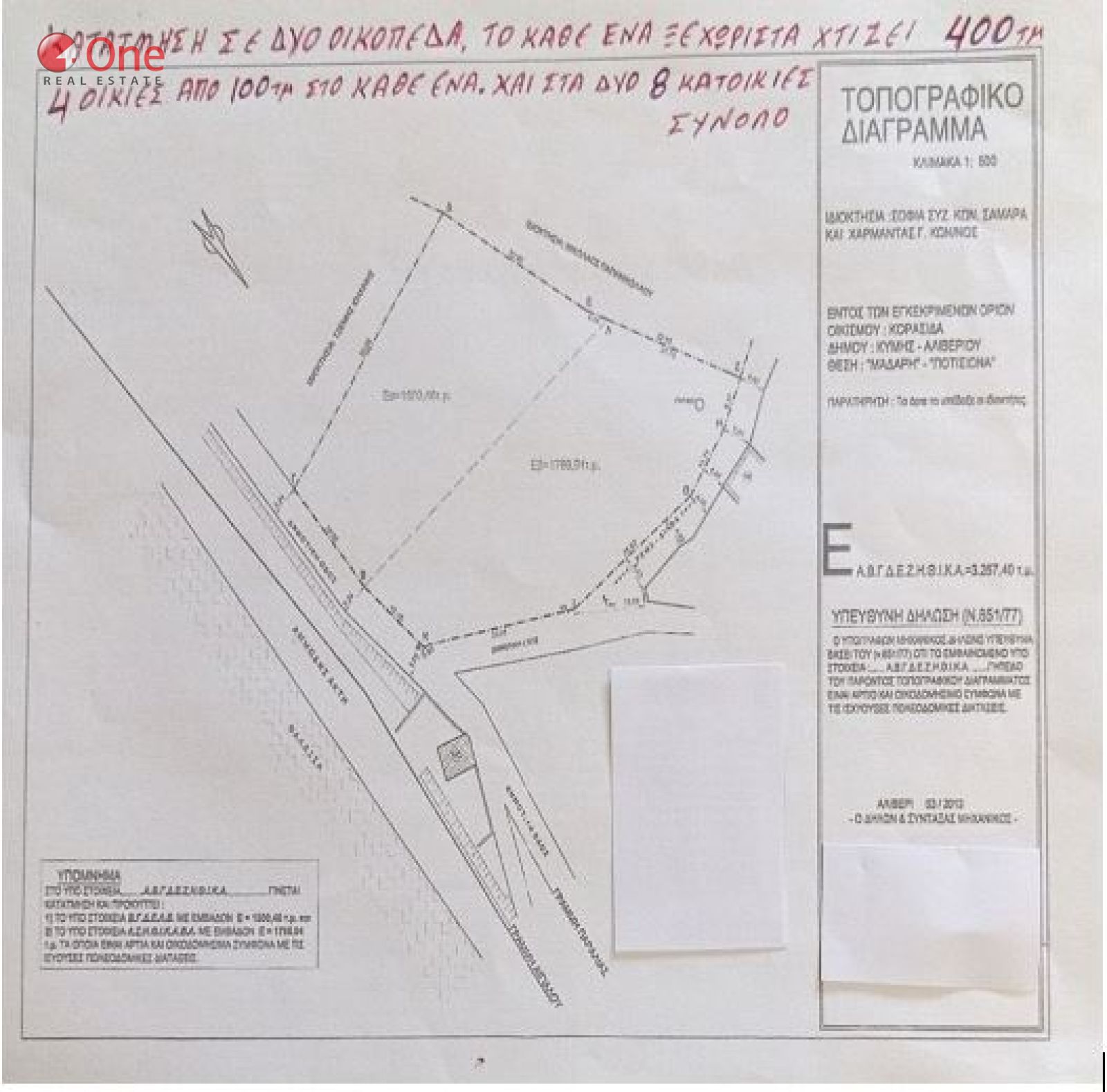 Εύβοια, Δήμος Κύμης Αλιβερίου,( Κορασίδα): Πωλείται παραθαλάσσιο οικόπεδο 3.267τμ. Κατάλληλο και για ξενοδοχειακή η επαγγελματική χρήση, ολόκληρο χτίζει 1.600τμ .Συντ.Καλυψ. 60%. Πρόσοψη 65μ. Ανατολικού προσανατολισμού. Το ακίνητο βρίσκεται στο κέντρο της παραλίας ενός χιλιομέτρου και παράλληλα με την άσφαλτο που συνορεύει με την θάλασσα, έχει αμφιθεατρική γωνία με ελεύθερη απεριόριστη θέα στο Αιγαίο- Σκύρο. Το οικόπεδο διαθέτει όλες τις εγκαταστάσεις. Κτηματολόγιο -Νερό -Ηλεκτρικό ρεύμα, τηλεφωνική σύνδεση και πηγάδι. Σε κοντινή απόσταση βρίσκονται πάρα πολλές άλλες παραλίες, όπως το ψαροχώρι Άγιοι Απόστολοι Πετριών (το οποίο διαθέτει λιμάνι και πολύ οργανωμένο τουριστικό περιβάλλον), Ο οικισμός Λιανή Άμμος, το Κλιμάκι (με ξενοδοχεία και ταβέρνες), το Κακολίμανο, ο πολυδιαφημιζόμενος Χερόμυλος (στον οποίο τώρα χτίζεται πολύ μεγάλο ξενοδοχείο), ο Μάγειρας και ο πολύ αξιόλογος Κάλαμος (ο οποίος διαθέτει οργανωμένο τουριστικό περιβάλλον και τρείς παραλίες). Βόρεια είναι το Αυλωνάρι με πάρα πολλά Αξιοθέατα (όπως ο Άγιος Δημήτριος-14ος αιώνας, μονή Λευκών-10ος αιώνας κ.α). Υπάρχουν συνεχόμενες παραλίες όπως ο οικισμός Μουρτερή, που είναι μια από τις μεγαλύτερες παραλίες της Εύβοιας, το Στόμιο, ο οικισμός Πλατάνα και τέλος η παραλία της αρχαίας Κύμης με το μεγάλο λιμάνι της και τα καθημερινά δρομολόγια για Σκύρο και Βόριες Σποράδες. Πωλείται ολόκληρο 340.000€ συζητήσιμη. Κατάτμηση σε δύο οικόπεδα , το κάθε ένα ξεχωριστά χτίζει 400τμ. ΕΚΑΣΤΟ ΤΕΣΣΕΡΙΣ ΟΙΚΙΕΣ ΤΩΝ 100τμ. ΣΥΝΟΛΟ ΚΑΙ ΣΤΑ ΔΥΟ ΟΙΚΟΠΕΔΑ ΟΚΤΩ ΟΙΚΙΕΣ.Μπορεί να πουληθεί ξεχωριστά και το μισό οικόπεδο όπως φωτο κατάτμησης 170.000 μόνο.