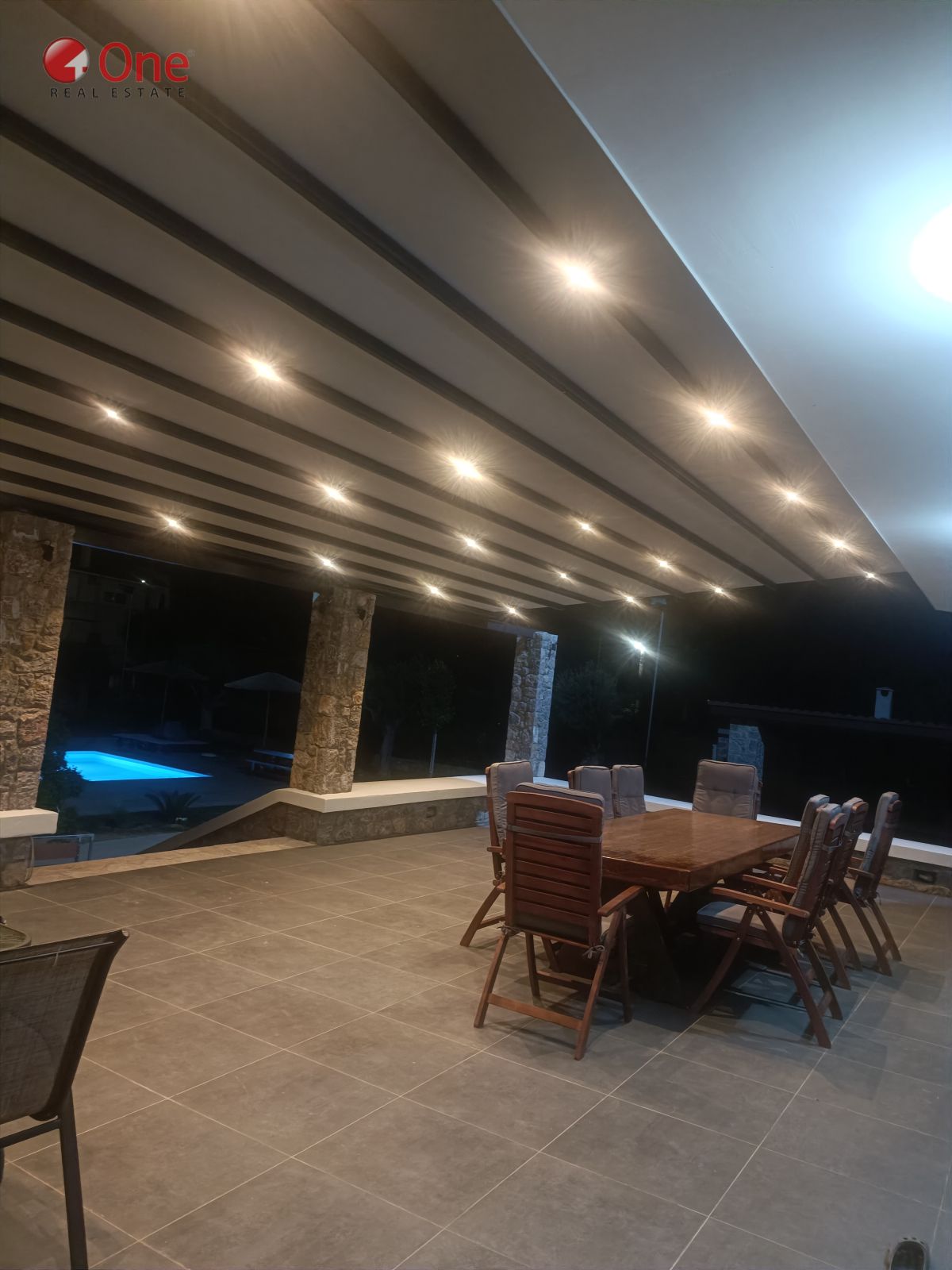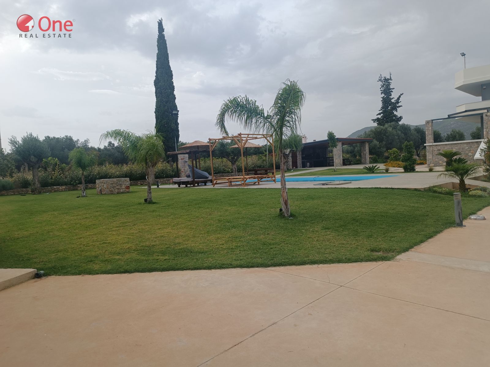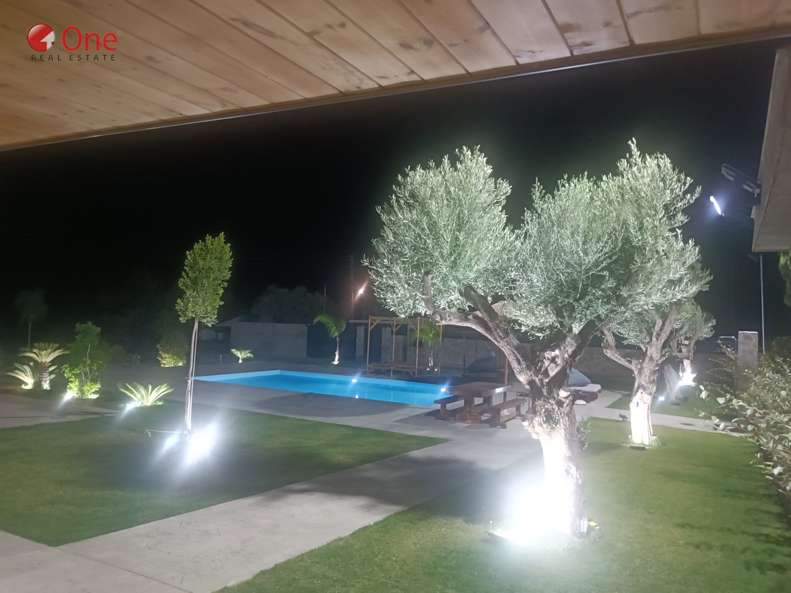 Στον εξωτερικό χώρο, υπάρχουν δύο σκεπαστά κιόσκια με τραπεζαρία και μεγάλα μπαλκόνια, μία πισίνα περιβαλλόμενη από δέντρα, σαλόνι, ξαπλώστρες και αιώρες, καθώς και βοηθητικοί χώροι. Το κτήμα διαθέτει γεώτρηση με άδεια 2022. Η υπερπολυτελής βίλα έχει ιδιωτική πισίνα και barbeque.
