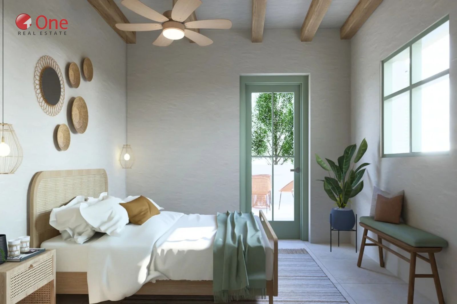 Στον επάνω όροφο, το κυρίως υπνοδωμάτιο διαθέτει ιδιωτική βεράντα με πανοραμική θέα στο βουνό και τη θάλασσα, καθώς και ένα δεύτερο μπάνιο.