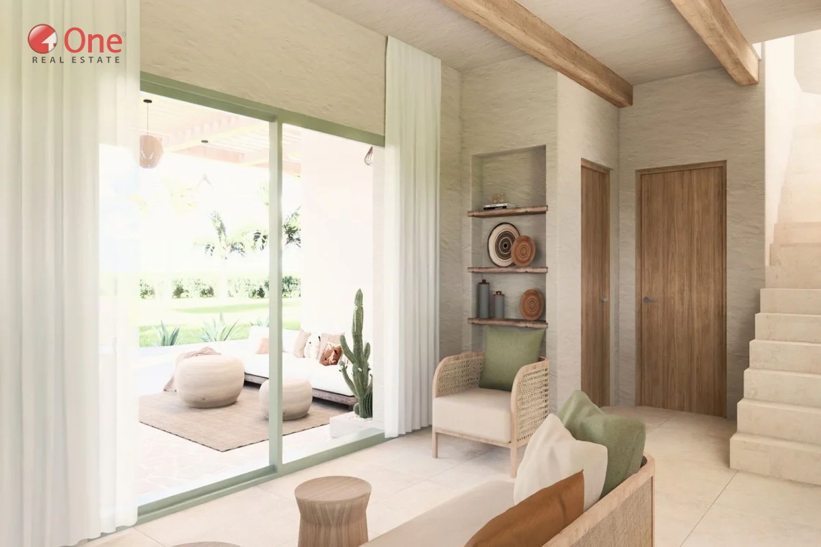 Το ισόγειο προσφέρει ένα ενιαίο σαλόνι, τραπεζαρία και κουζίνα, με μεγάλες πόρτες που ανοίγουν στον κήπο και την πισίνα, με εξωτερικό ντους, ξαπλώστρες και πέργκολα για δείπνο σε εξωτερικό χώρο. Ένα υπνοδωμάτιο με διπλό κρεβάτι και ένα μπάνιο συμπληρώνουν αυτό το επίπεδο.