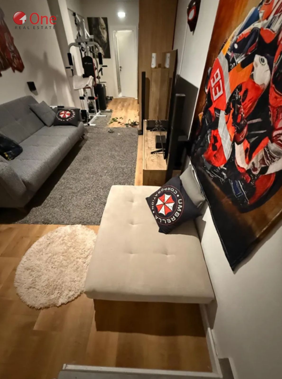 The expansive sitting room offers ample space for relaxation and customization, while a supplementary storage room enhances the property's practicality. Unfurnished with elegant wood flooring, the home provides a blank canvas for your personal touch.