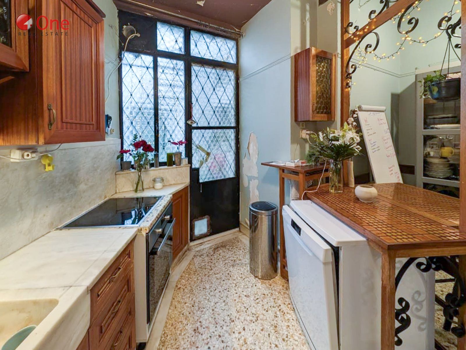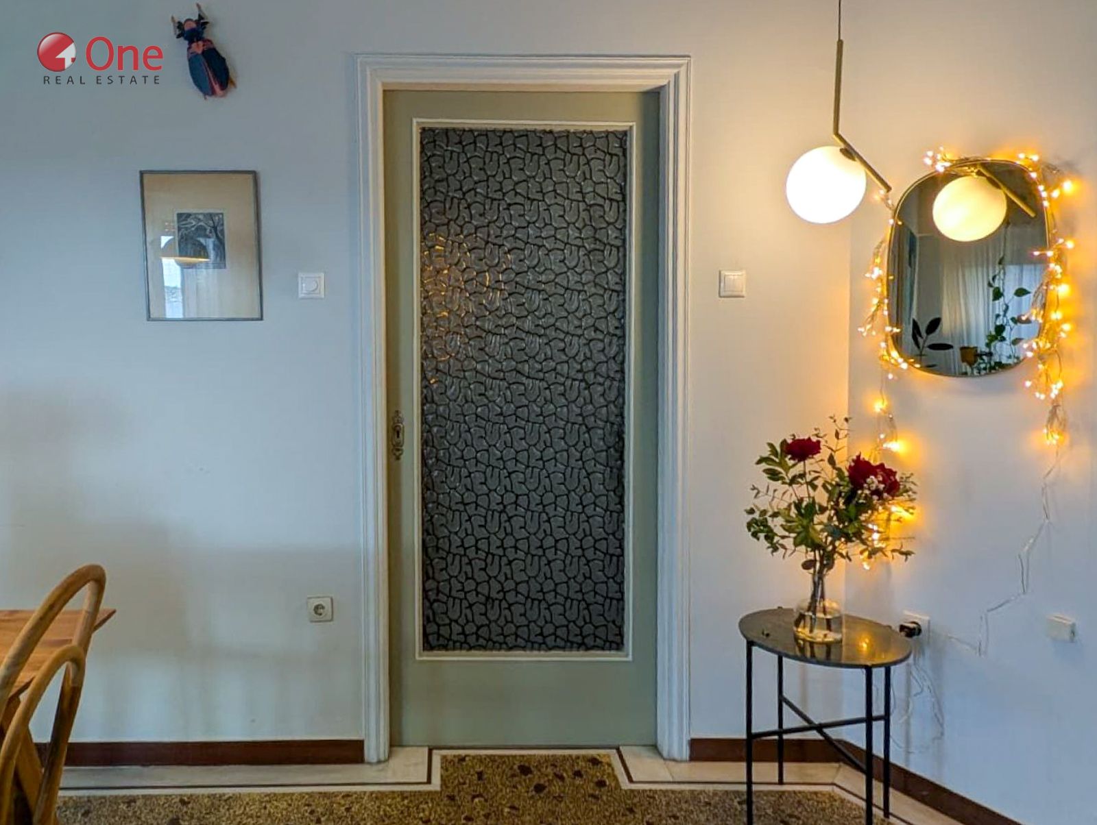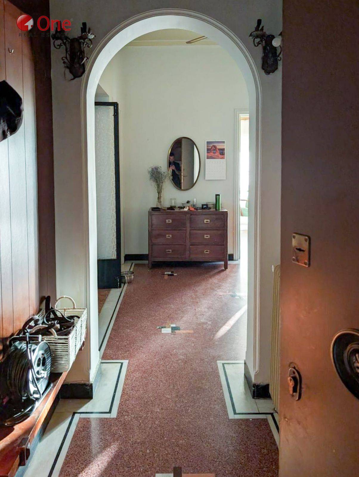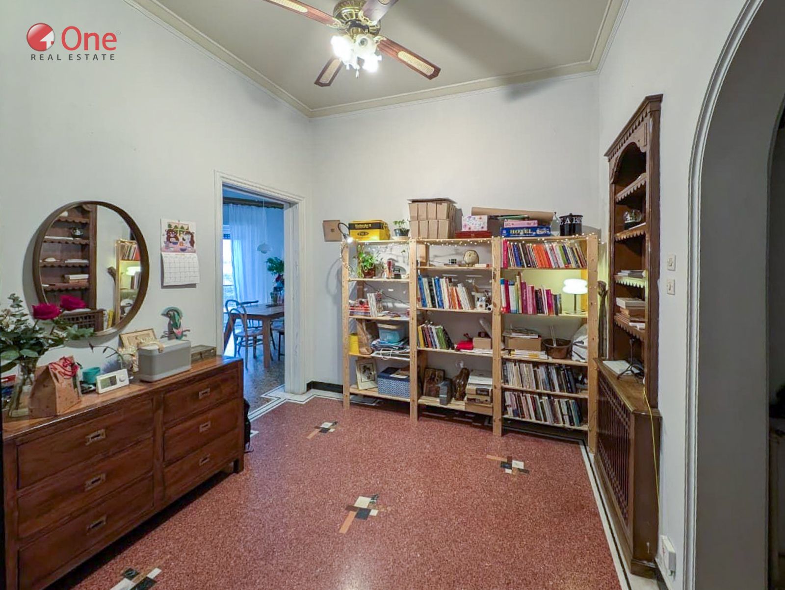 The apartment features beautifully preserved mosaic floors, enhancing its classic and timeless character.